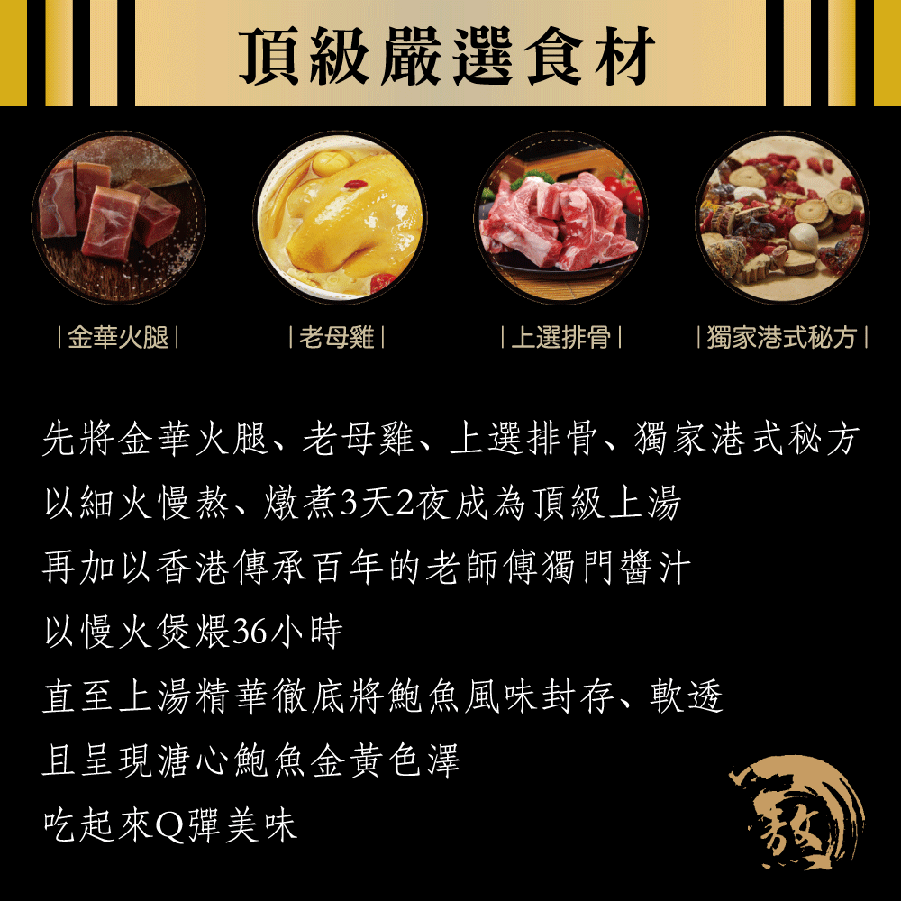 4.內容物成分(如含有豬、牛成分請加註國別):鮑汁(水、雞肉、豬肉(中國)乾鮑魚、蠔油(蠔汁、水、鹽)、玉米澱粉、醬油(水、脫脂大豆、小麥、鹽、酵母萃取物)、冰糖、鹽)、鮑魚