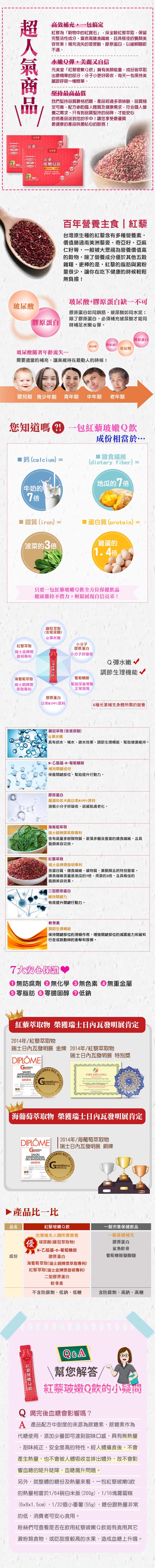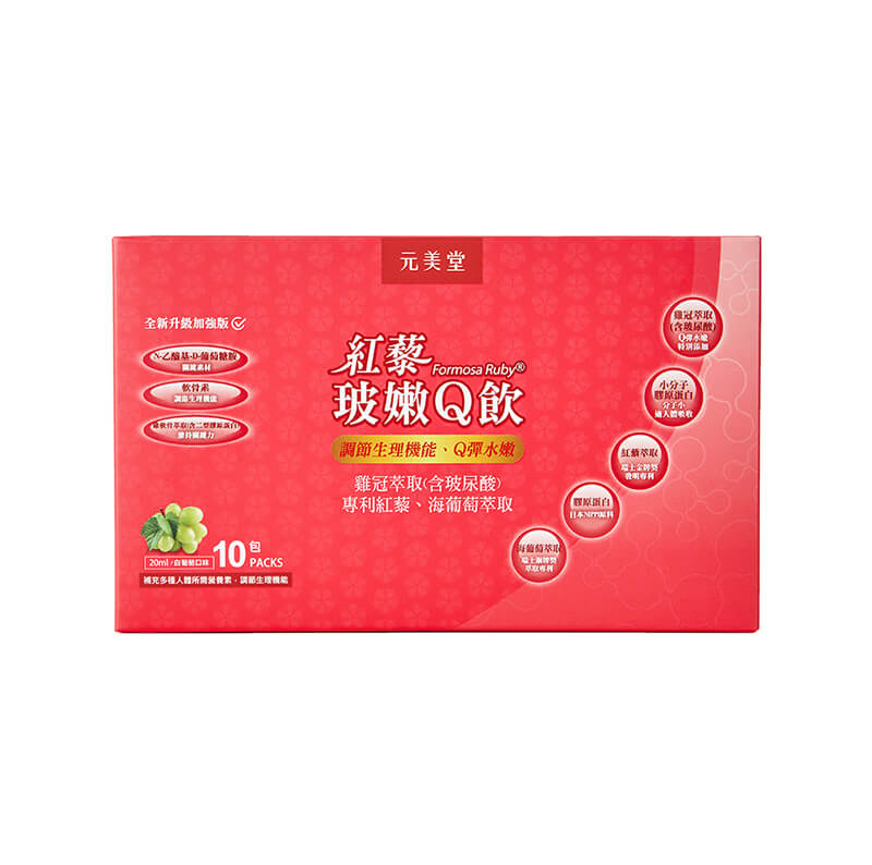 補充人體所流失的玻尿酸、膠原蛋白,可增強體力,有效調節生理機能。採用穀物中的紅寶石、台灣紅藜,全穀紅藜萃取保留完整活性成分,富含高膳食纖維,具有極佳的養顏美容功效。